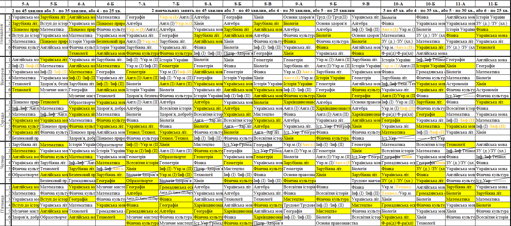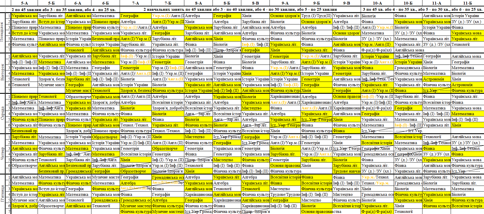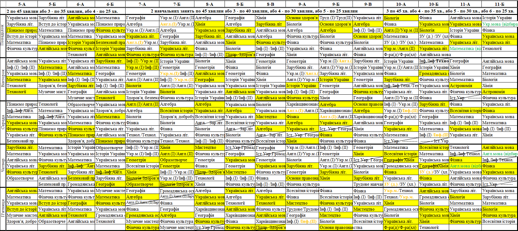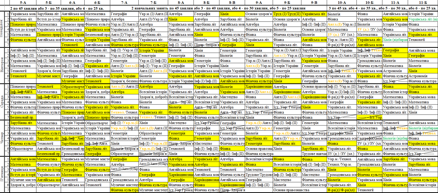 Розклад синхронних/асинхронних уроків для 5-11 класів