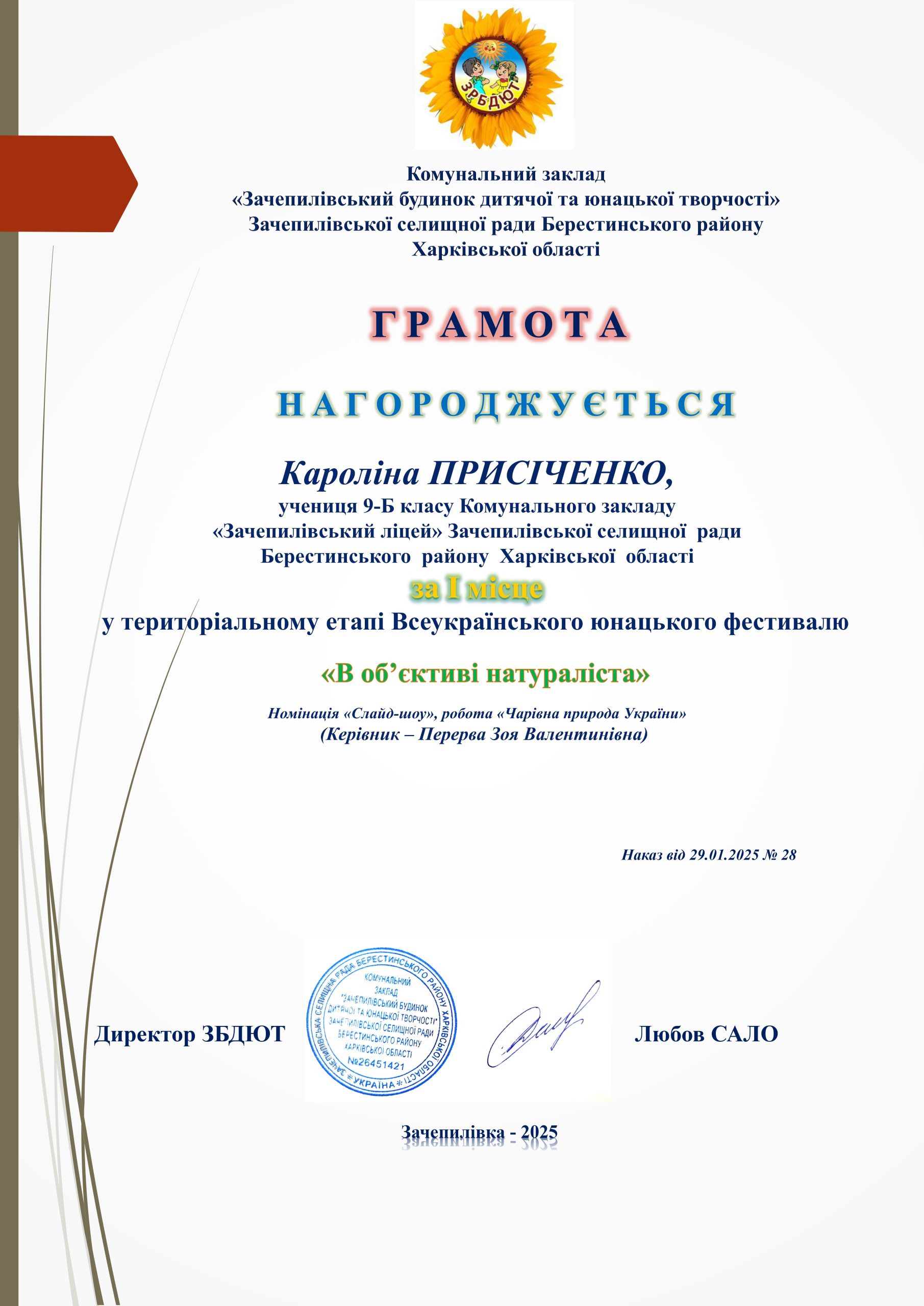 З метою пошуку та розкриття нових юних талантів, формування в учнівської молоді активної життєвої позиції, національної та громадянської ідентичності, екологічної культури засобами кіно- та фотомистецтва, тренування навичок спілкування мовою візуального мистецтва 28 січня 2025 року проведено територіальний етап Всеукраїнського юнацького фестивалю «В об’єктиві натураліста» в дистанційному форматі.