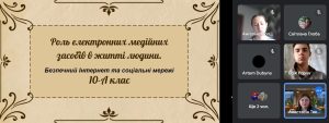 Учні ознайомилися з впливом електронних медіа на повсякденне життя, їхніми перевагами та ризиками. Обговорили найпопулярніші серед підлітків медійні платформи та їхній вплив на інформаційну грамотність, комунікацію та дозвілля. Для кращого розуміння теми учні переглянули відео про безпеку в Інтернеті та соціальних мережах. У ньому висвітлювалися такі питання, як захист персональних даних, правила